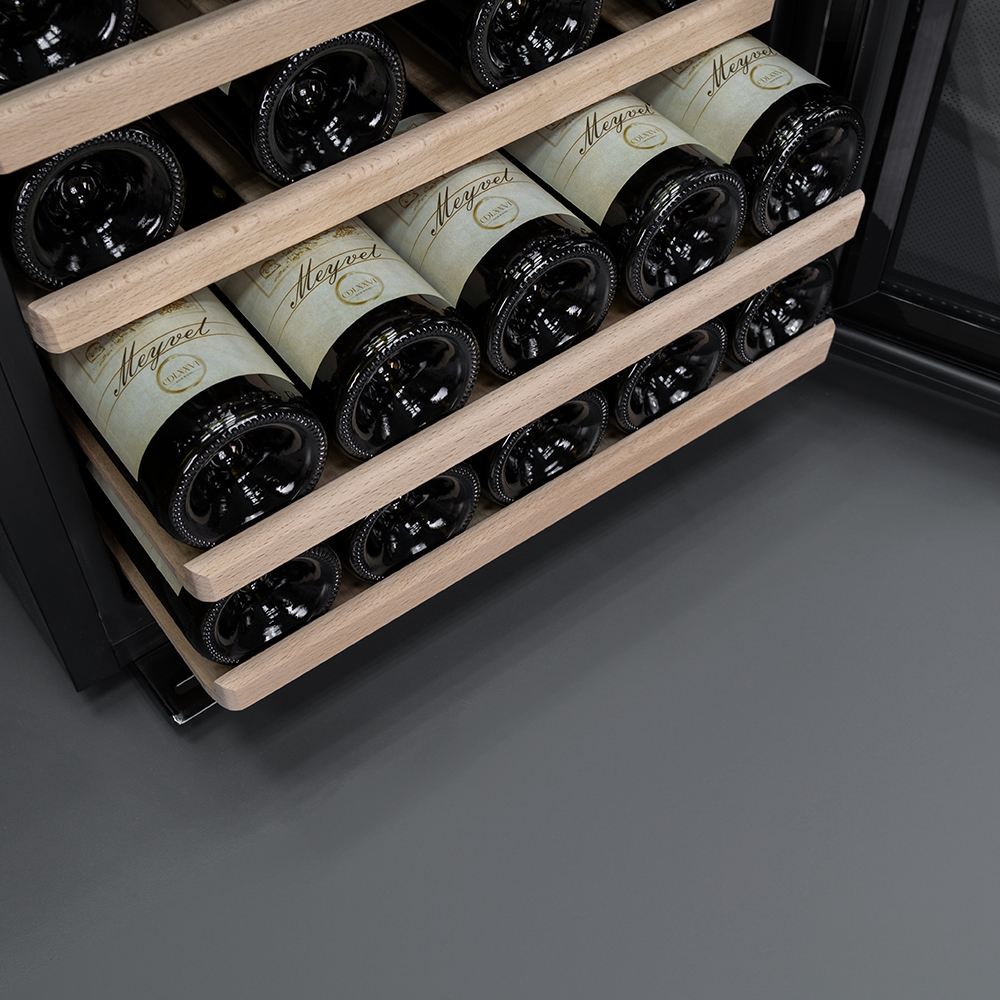 Для размещения винных бутылок, шкаф оснащен 7 крепкими полками из массива бука: выдвижные (5), выдвижные полуполки (3).