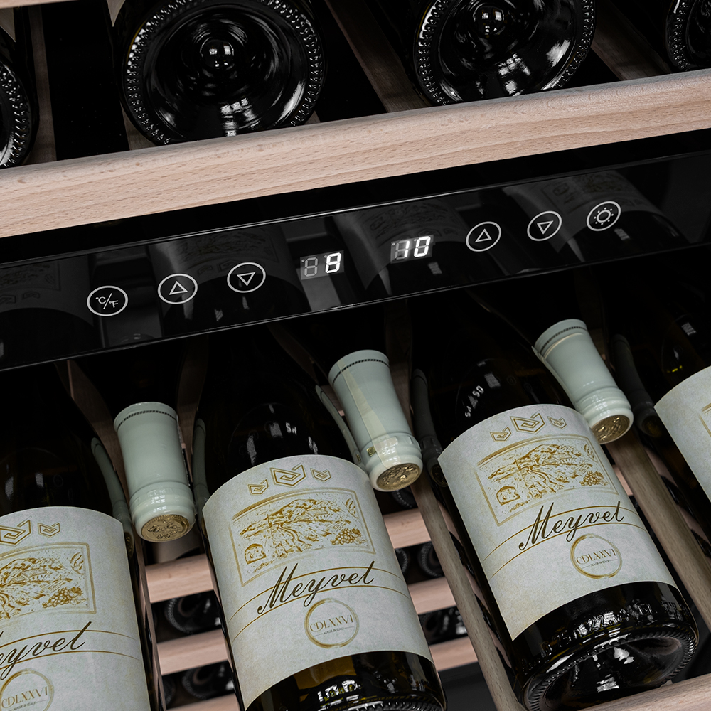 Винные бутылки, расположенные внутри шкафа, надёжно защищены от вредоносных ультрафиолетовых лучей двойным стеклом, установленным в дверцу.