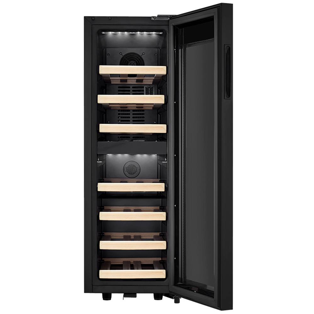 корпус MV19-KBF2 выполнен из стали окрашенной в чёрный цвет, современная технология освещения позволит Вам в любое время эффектно продемонстрировать Вашу винную коллекцию гостям.