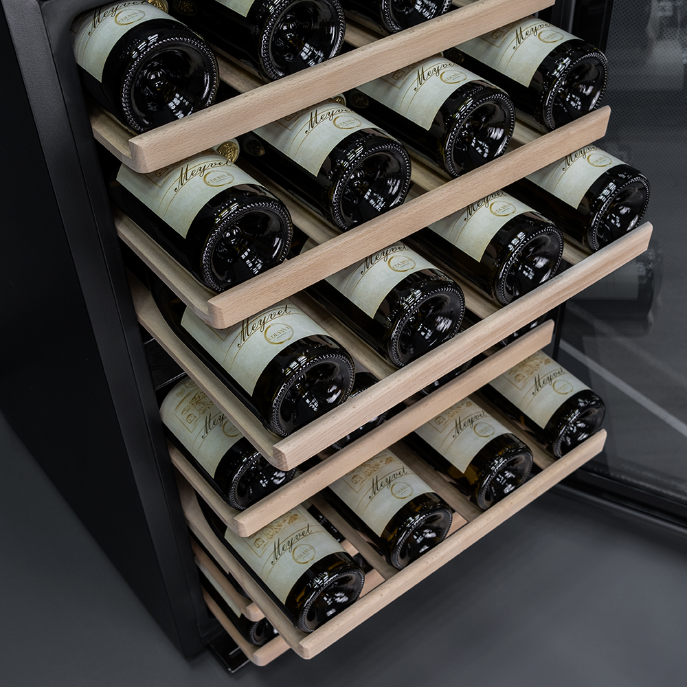 Благодаря продуманному внутреннему исполнению и съемным полкам Вы сможете размещать бутылки любого объема. Внутреннее пространство рассчитано на хранение до 45 бутылок типа Бордо (0,75 л). При желании можно