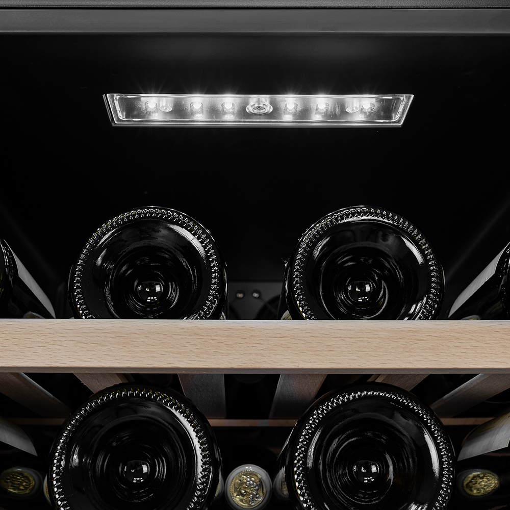 Винные бутылки, расположенные внутри шкафа, надёжно защищены от вредоносных ультрафиолетовых лучей двойным стеклом, установленным в дверцу.