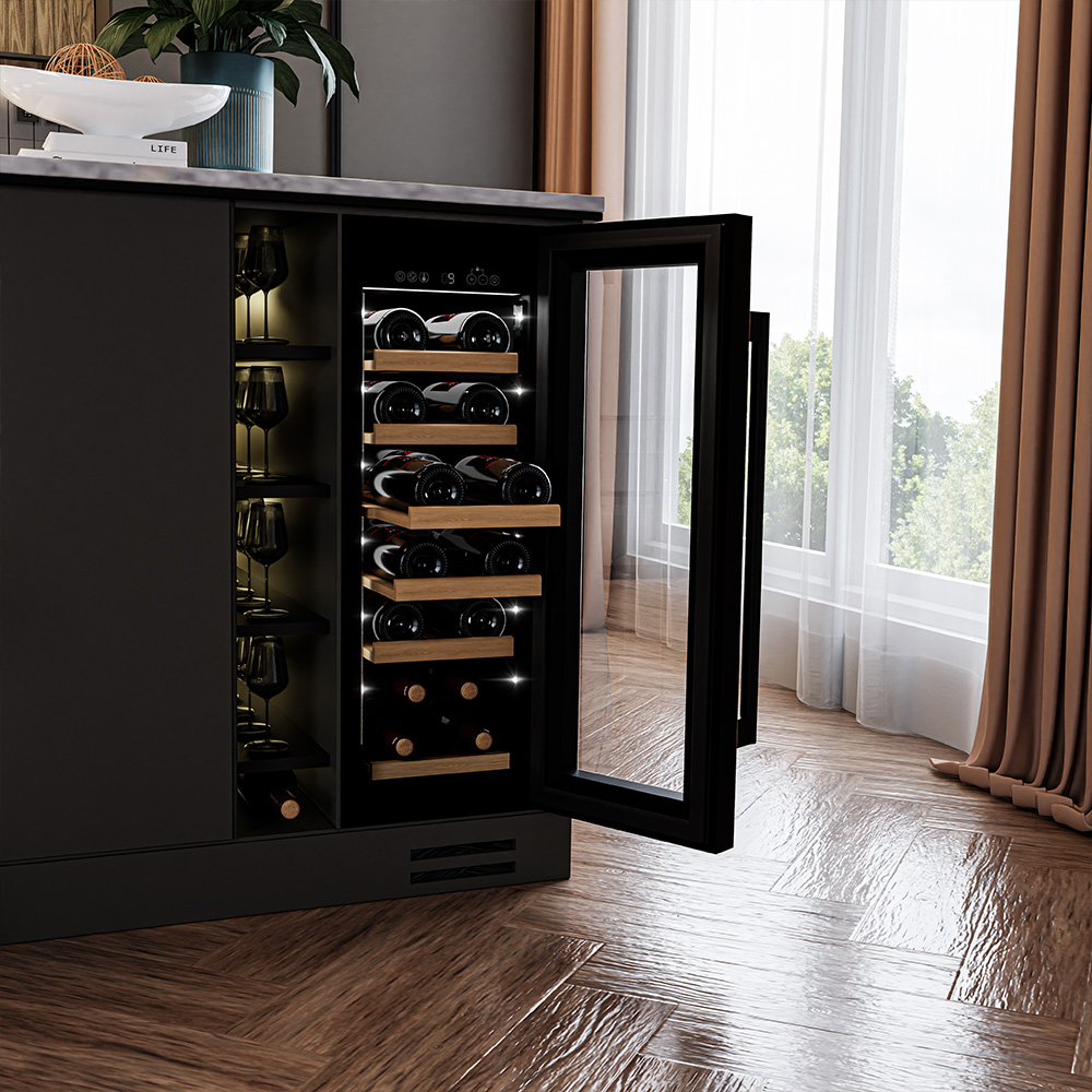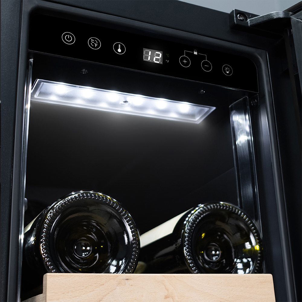 Компрессорный винный шкаф Meyvel MV19-KBT1 обладает оптимальной вместимостью и даёт возможность разместить до 19 бутылок стандартного типа Бордо (0,75 л). Располагаются они на выдвижных полках из дерева. Внутреннее пространство шкафа поддерживает комфортную для вина температуру от +5°C до +20°C. Так же, эта модель поддерживает влажность в диапазоне 60-80%, как в настоящем винном погребе.
