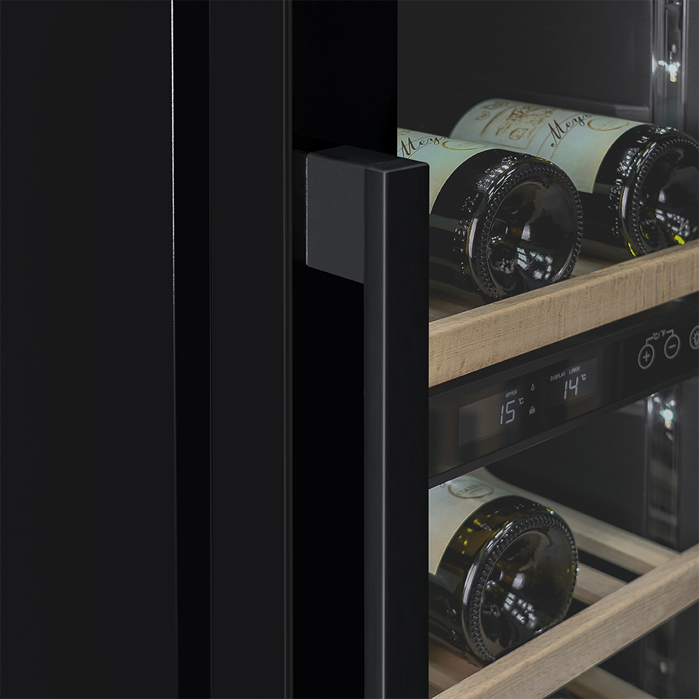 Компрессорный винный шкаф Meyvel MV28-KBT2 обладает большой вместимостью и даёт возможность разместить до 28 бутылок стандартного типа Бордо (0,75 л). Располагаются они на выдвижных полках из дерева. Внутреннее пространство шкафа разделено на 2 температурные зоны, с возможностью настраиваить каждую из них. Общий диапазон температуры у данной модели от +5°C до +20°C.