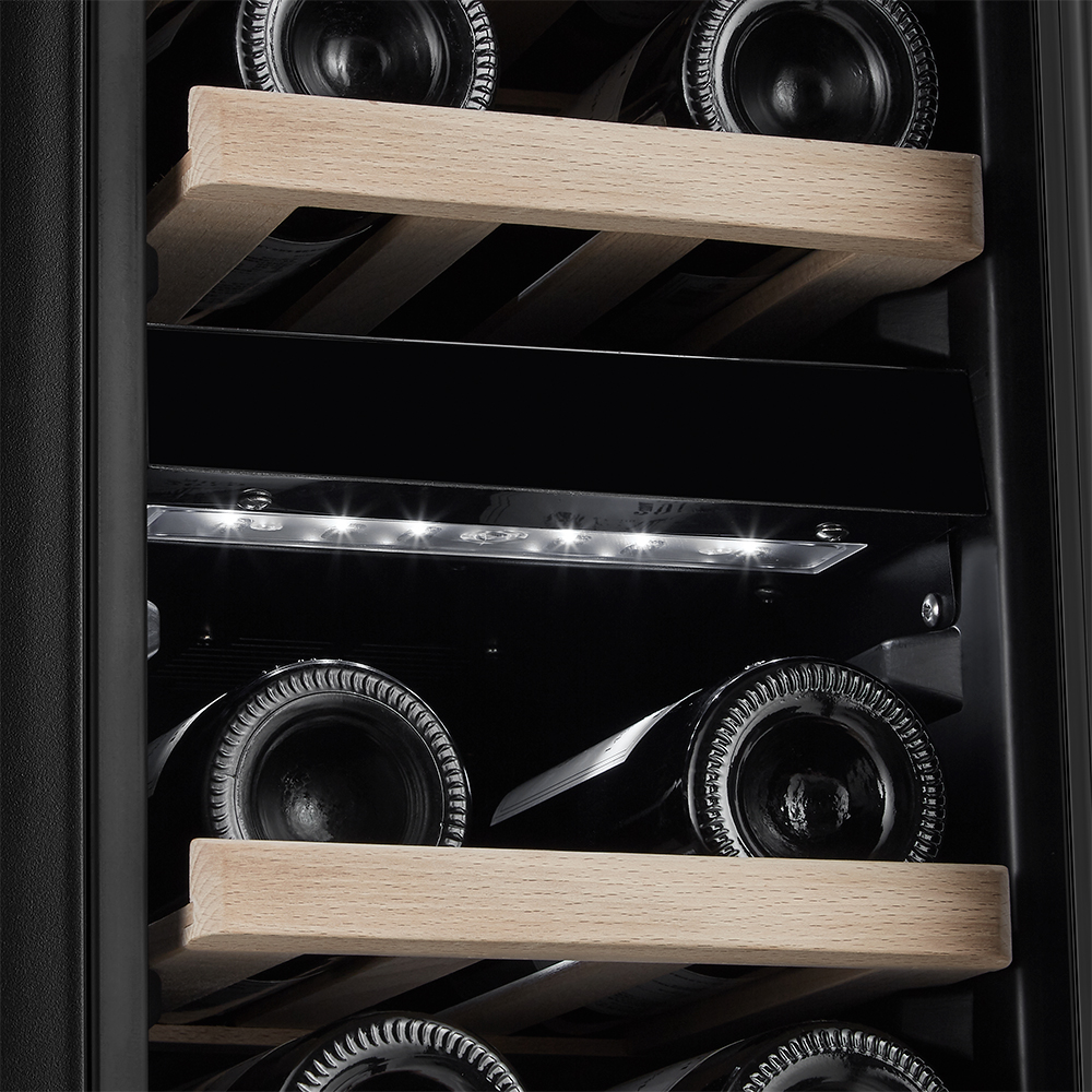 корпус MV19-KBF2 выполнен из стали окрашенной в чёрный цвет, современная технология освещения позволит Вам в любое время эффектно продемонстрировать Вашу винную коллекцию гостям.
