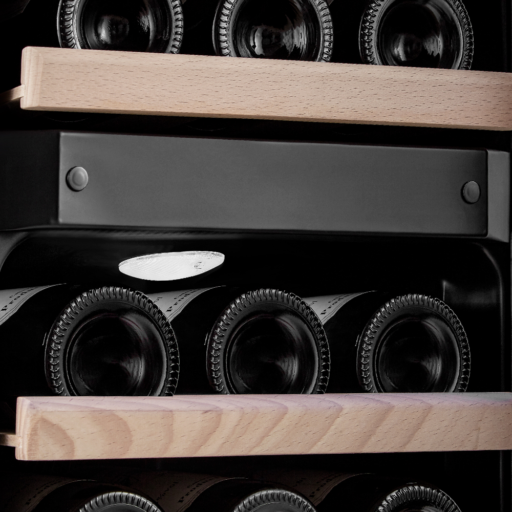 Внутреннее пространство шкафа разделено на 2 температурные зоны с возможностью настраивать каждую из них в диапазоне от +7 °C до +18 °C. Холодильник поддерживает влажность в диапазоне 50-80%, как в настоящем винном погребе.