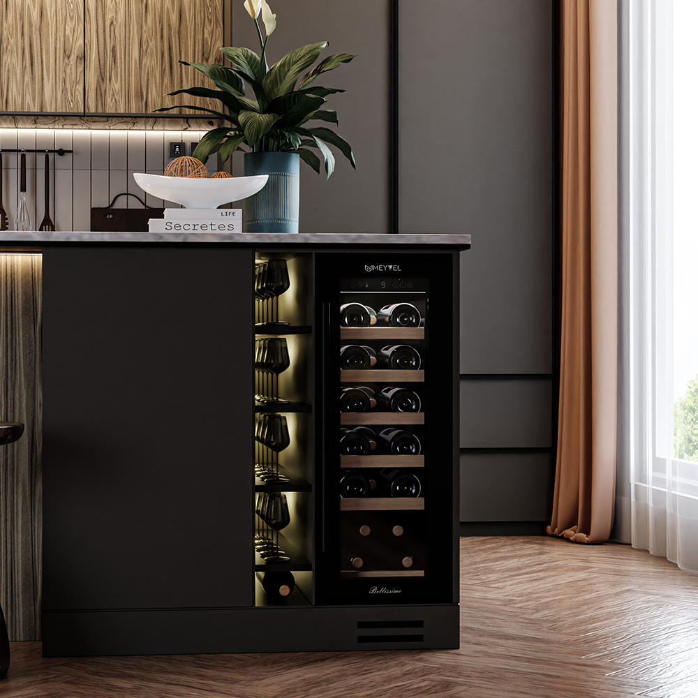 Компрессорный винный шкаф Meyvel MV19-KBT1 обладает оптимальной вместимостью и даёт возможность разместить до 19 бутылок стандартного типа Бордо (0,75 л). Располагаются они на выдвижных полках из дерева. Внутреннее пространство шкафа поддерживает комфортную для вина температуру от +5°C до +20°C. Так же, эта модель поддерживает влажность в диапазоне 60-80%, как в настоящем винном погребе.