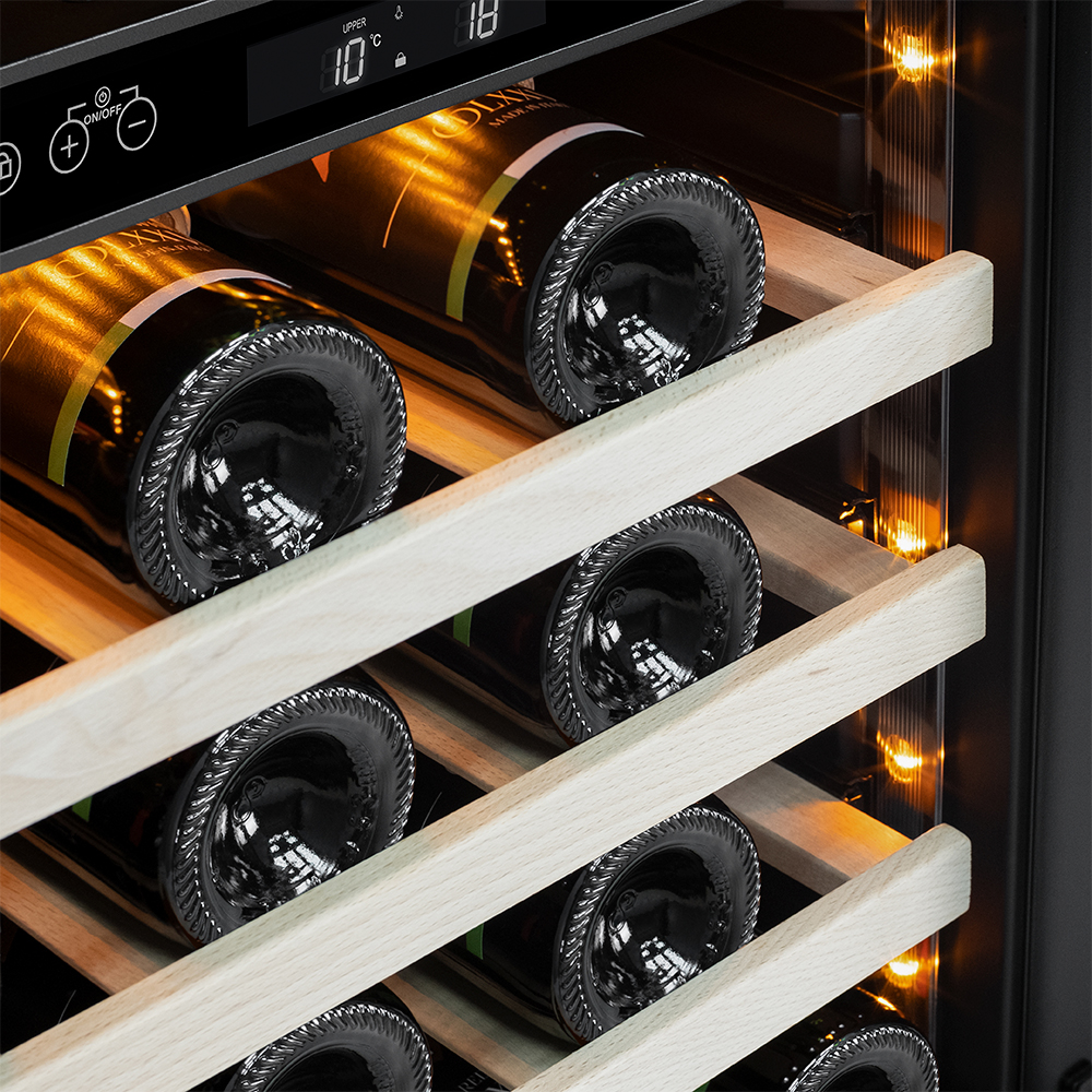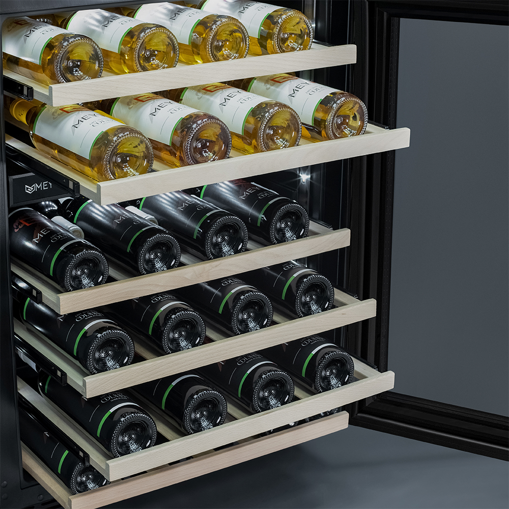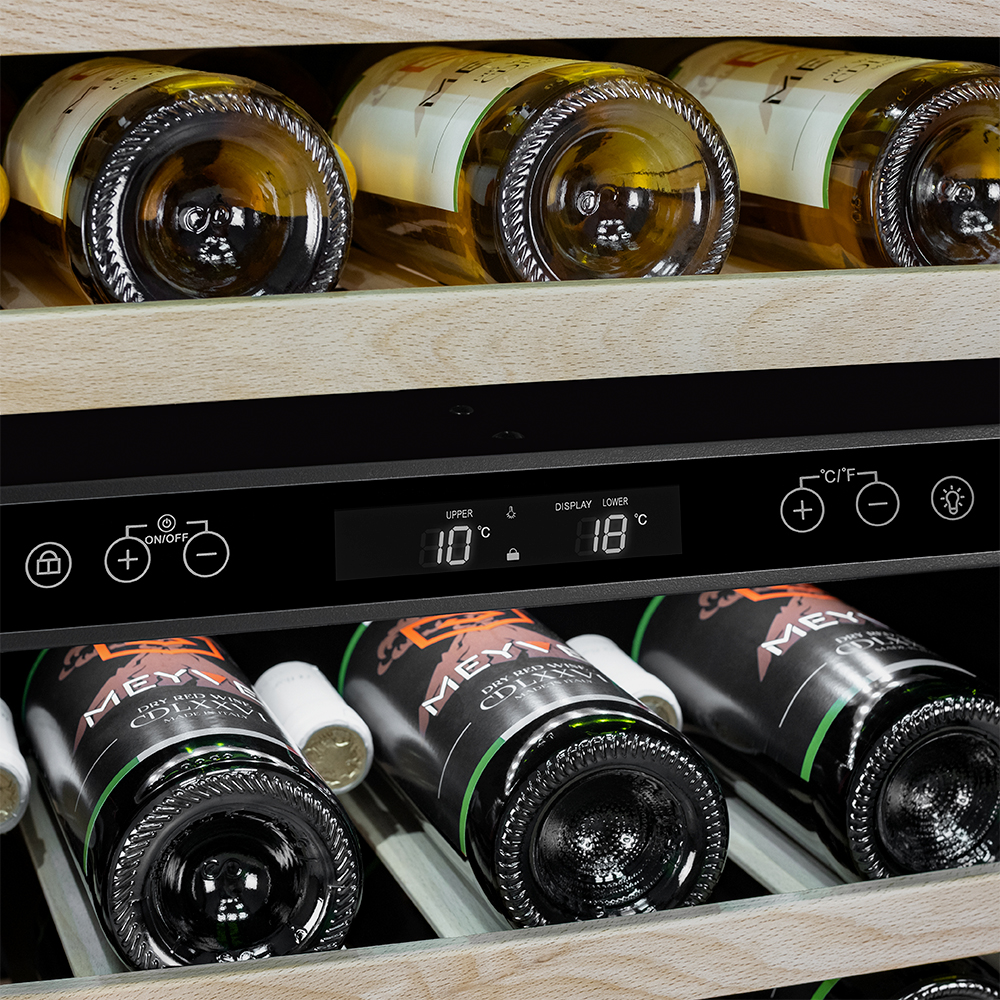 Компрессорный винный шкаф Meyvel MV46NH-KBT2 обладает большой вместимостью и способен разместить до 46 бутылок. Располагаются они на полках из массива бука. Внутреннее пространство шкафа разделено на 2 температурные зоны с возможностью настраивать каждую из них (верхняя зона имеет диапазон от +5 до +12, а нижняя - от +12 до +20). Холодильник поддерживает влажность в диапазоне 60-80%, как в настоящем винном погребе.