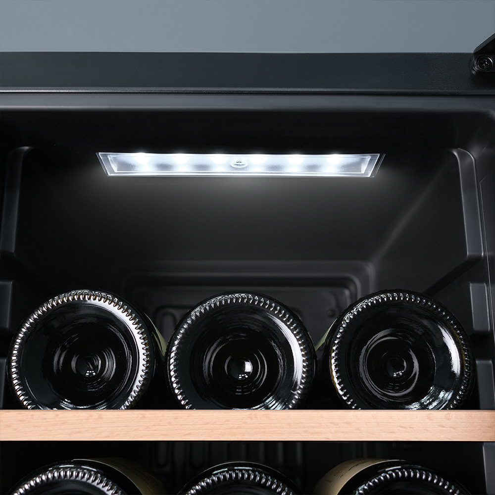 Сенсорное управление позволяет легко установить и поддерживать нужную температуру и влажность. LED-подсветка придает шкафу презентабельный вид и облегчает доступ к его содержимому.