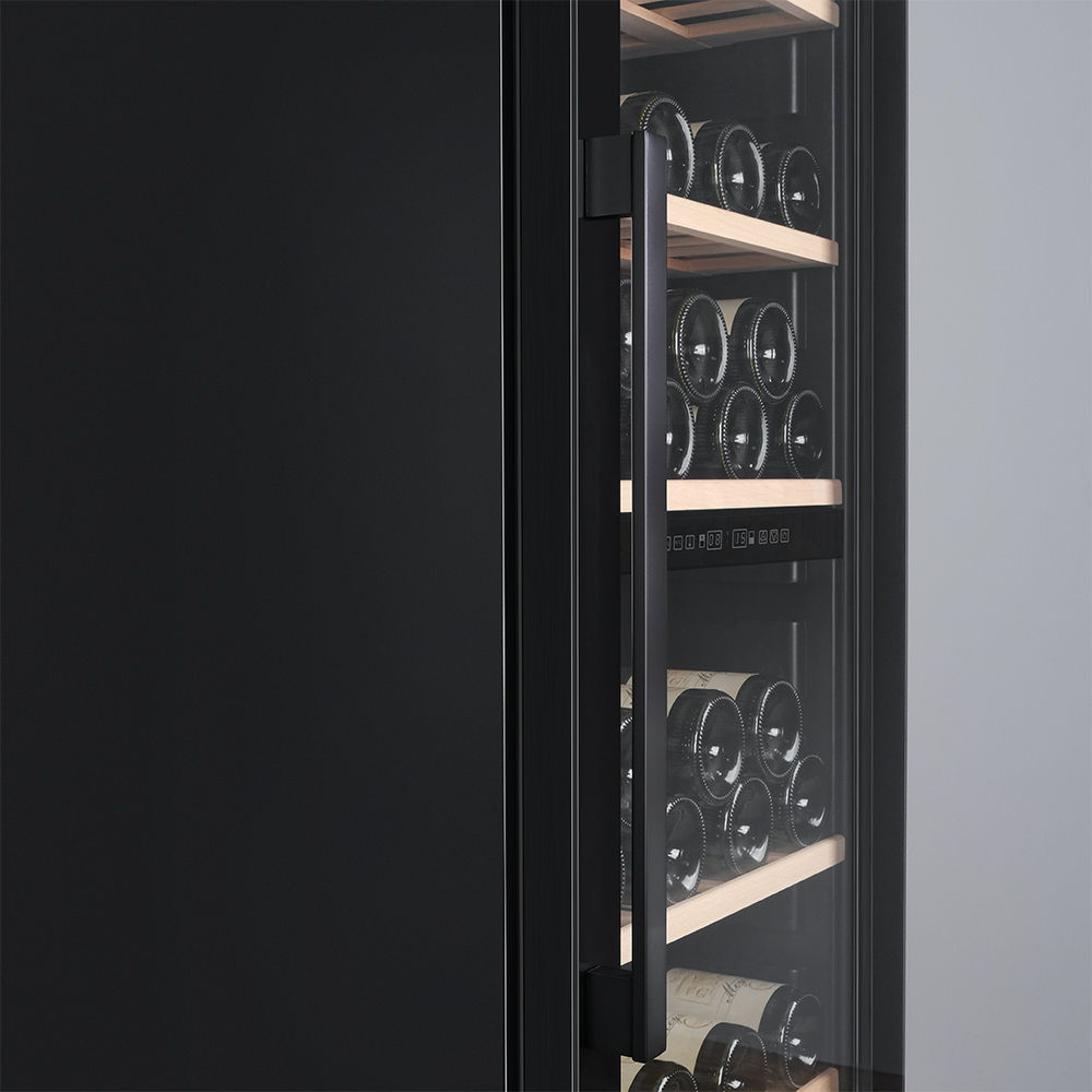Управление осуществляется через сенсорную панель, а настройка интуитивно понятна. Также предусмотрены важные функции для защиты винотеки: замок на двери для безопасности, угольный фильтр, который очищает воздух внутри шкафа от посторонних запахов, сигнализация отклонения температуры, которая предупреждает о любых изменениях в условиях хранения, и блокировка панели управления, предотвращающая случайные изменения настроек.